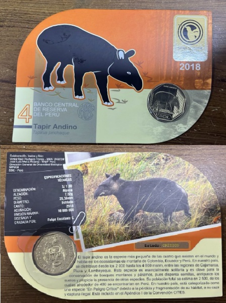 • PERU - MOEDA NO COINCARD  DE 1 NUEVO  SOL EMITIDA EM 2018 PARTE DA SERIE FAUNA SILVESTRE AMEAÇADA DE EXTINÇÃO  TAPIR ANDINO