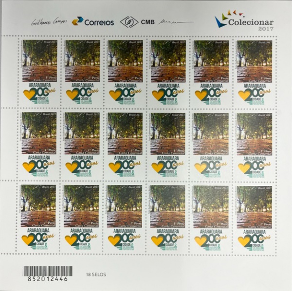 • BRASIL FOLHA COMPLETA DO ANO 2017 COM 18 SELOS HOMENAGEM AOS 200 ANOS DE ARARAQUARA- FOLHA  ESGOTADA  NOS CORREIOS - BLOCO EM ESTADO MINT DE CONSERVAÇÃO