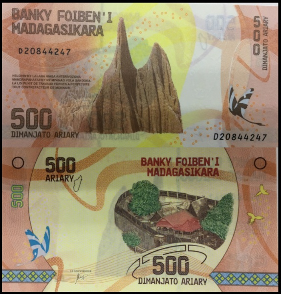 • MADAGASCAR - CEDULA EM ESTADO FLOR DE ESTAMPA DE CONSERVAÇÃO DE 500 ARIARY