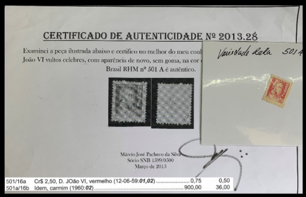 • RARO SELO D JOÃO RHM 501 A CARMIM COM CERTIFICADO VALOR DE CAT 900 UFS OU R$ 3600 REAIS