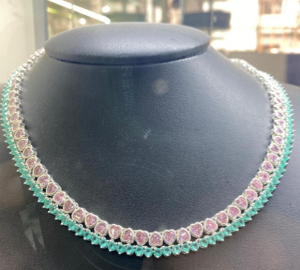 • PAR DE COLARES EM PRATA 950 COM ZIRCONIA ROSA E VERDE  - BÉLISSIMO COLAR EXTRA LUXO MARAVILHOSO CONFORME A FOTO EXIBIDA  !R$ 1800