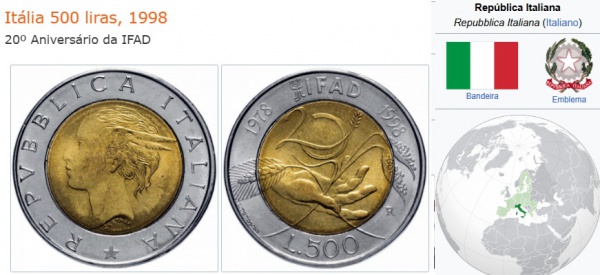 • ITALIA MOEDA F A O DE  500 liras DO ANO 1998 COMEMORATIVA A 20º Aniversário da IFAD - EM ESTADO SOBERBO  DE CONSERVAÇÃO