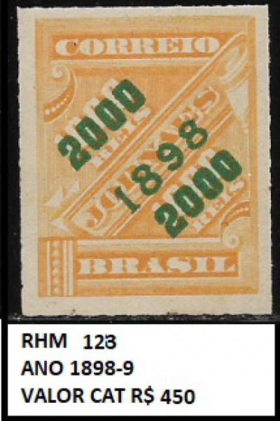 • RHM 123  MUITO ESCASSO - SELO JORNAL DO ANO 1898 A 9 MARCA R$ 450  REAIS DE CAT - SELO EM EXCELENTE ESTADO DE CONSERVAÇÃO