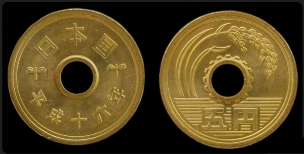 • JAPÃO MOEDA DE 5 YENES COM FURO CENTRAL PARA USO EM CORDÃO - EM ESTADO FLOR DE CUNHO DE CONSERVAÇÃO!!