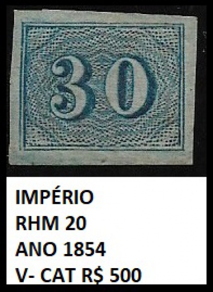 • IMPÉRIO - SELO OLHO DE GATO AZUL RHM 20 ANO 1854 VALOR DE CAT - R$ 500 REAIS - SELO COM MARGENS PERFEITAS E SEM CARIMBO BÉLISSIMO ESTADO DE CONSERVAÇÃO CONFORME FOTO EXIBIDA