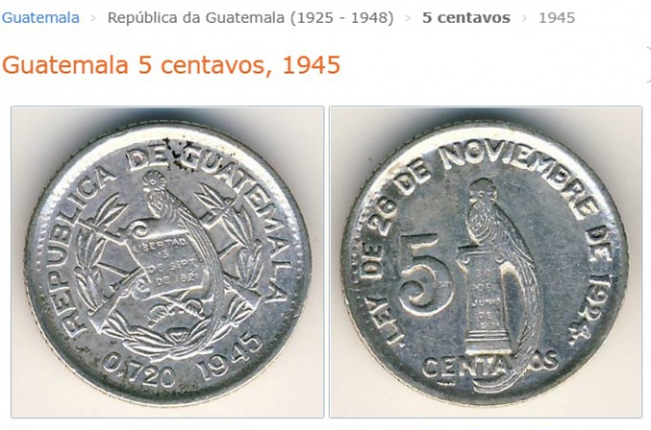 • GUATEMALA   MOEDA DE PRATA DE 5 CENTAVOS  DO ANO 1945  ESCASSA  -   EM ESTADO  SOBERBO  DE CONSERVAÇÃO !