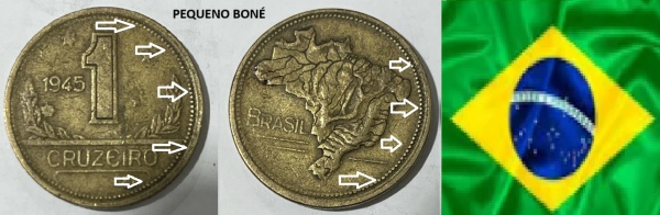 • BRASIL MOEDA DE 1 CRUZEIROS DO ANO 1945 COM PEQUENO BONÉ  COM PATINA NATURAL!!!
