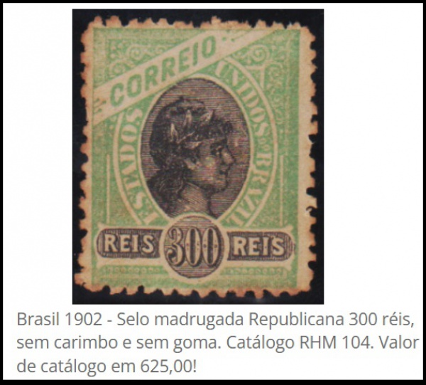 • Brasil 1902 - Selo madrugada Republicana 300 réis, sem carimbo e sem goma. Catálogo RHM 104. Valor de catálogo em 625,00!