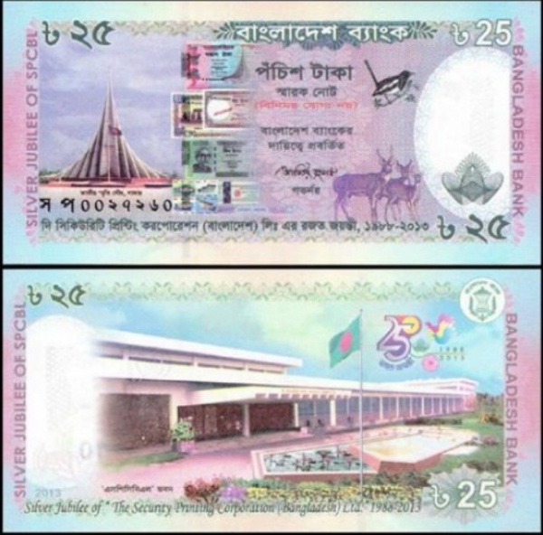 • Bangladesh CEDULA COMEMORATIVA  DE  25 Taka DO ANO 2013 EM ESTADO FLOR DE ESTAMPA