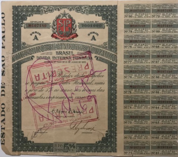 • APÓLICE DO ESTADO DE SÃO PAULO DO ANO 1935 COM UM BELO CARIMBO DE PRESCRITO